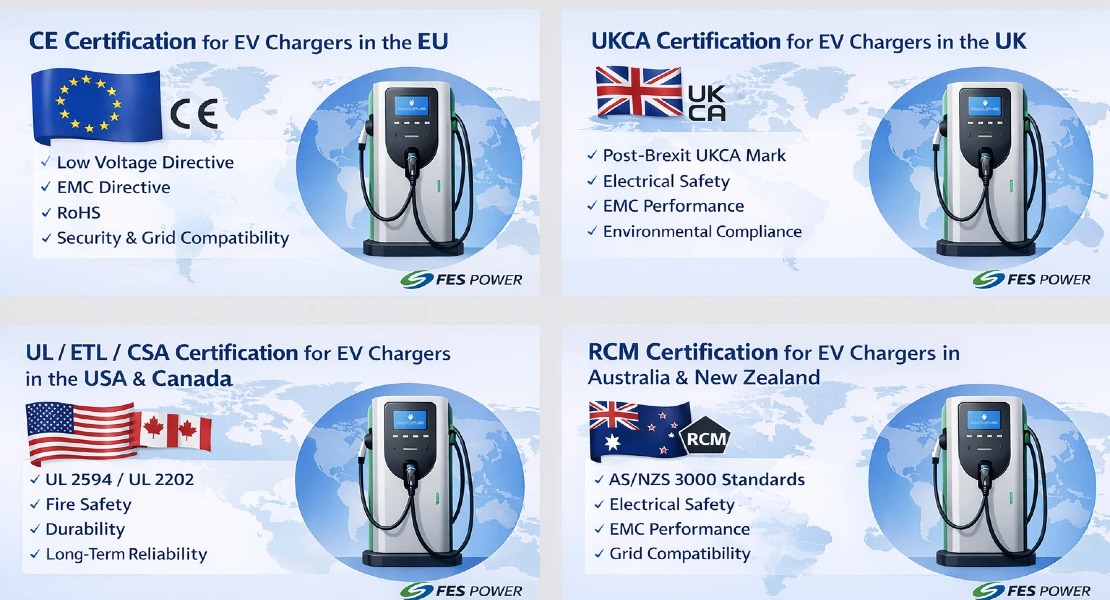 Before selling or exporting EV chargers, understanding certification requirements is essential. Different countries require different approvals, and each certification focuses on safety, grid compatibility, EMC performance, and user protection.